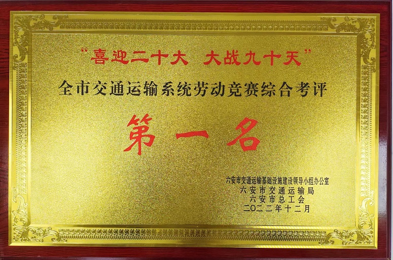 近日,公司在六安市交通運輸局和六安市總工會組織的“喜迎二十大、大戰(zhàn)九十天”全市交通運輸系統(tǒng)勞動競賽綜合考評中獲第一名。同時參與建設的S244羅崗至分路口段公路工程(二期)03合同段項目和G237六安馬頭至舒城萬佛湖工程(一期)項目在勞動競賽中被評為“優(yōu)秀施工單位”。
